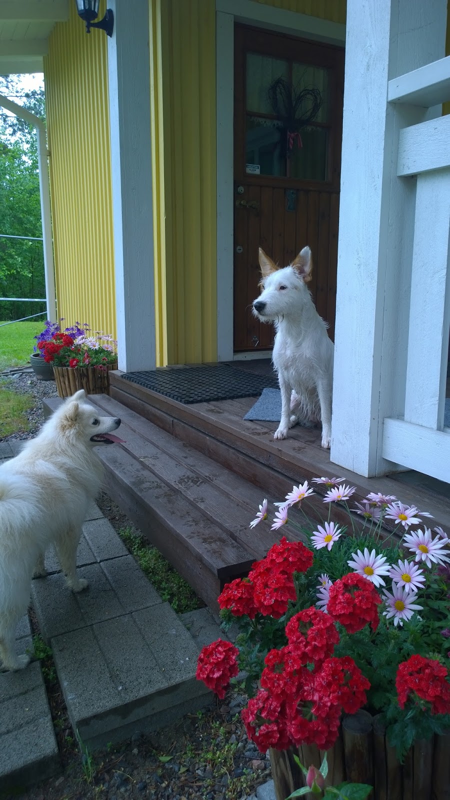 Ja tulihan sitä vähän levättyäkin. Ja katsottua karsinnat livestriimistä. Ja mökkeiltyä. Heitettiin talviturkit. Flaksikin rantasipin perässä laiturilta pudonneena vähän vahingossa. ;) Mutta ehkä Flaksista vielä uimari saadaan. Kyllä neiti jo kahlaili ennen putoamista oma-aloitteisesti parsonien perässä.