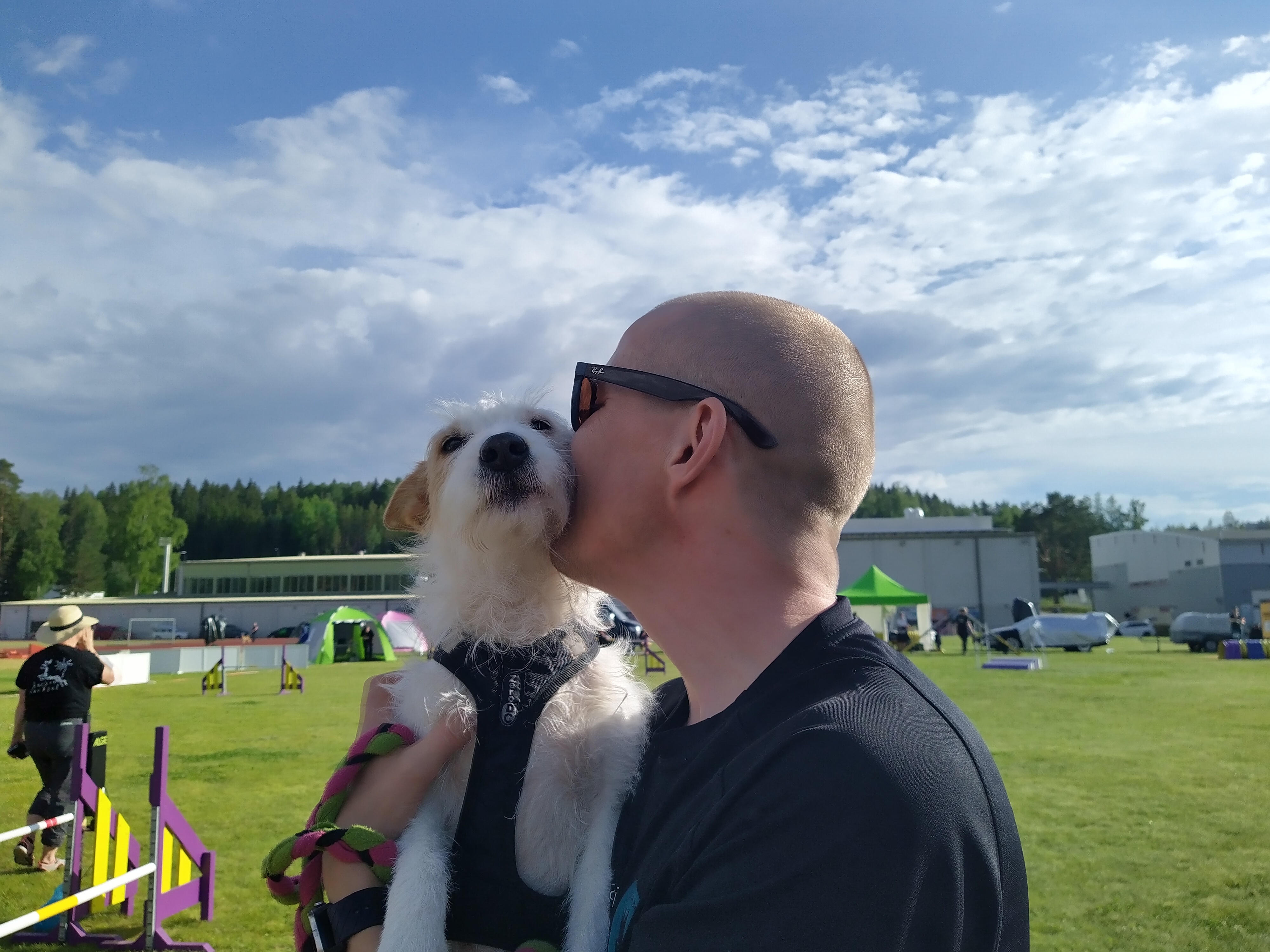Eilen olimme Lohjalla iltakisoissa Marko Kivihalmeen radoilla. Aivan supermukavia ratoja, joissa sai tikata sekä koirat että ohjaajat ihan tosissaan. Ja jokaisella radalla oli paikkoja, jotka saattoi ohjata halutessaan myös leijeröiden. Kyllä tykättiin! Agiradalla Flaksi ei ottanut puomia lainkaan, askel ei vaan osunut. Venytys puomin päällä jäi tekemättä, tuomarin mukaan mahdollisesti hieman epäonnistuneen puomille saapumislinjan takia. Keinusta päästiin nillittämään kriteeriä, hyvähyvä! Sitten oli sellainen hieno hyppärirynnistys, että oksat pois! Leijeröinti meni nappiin, ja radalta irtosi voitto. Maanantain Olli Leinon juoksutreenien jäljiltä ohjaajan etureidet vaan olivat niin kireinä, että toinen alkoi oikuttelemaan repäisyn päätteeksi huolellisesta lämmittelystä huolimatta. Niinpä viimeinen rata otettiin suosiolla vain muutaman esteen paikkaharjoituksena.
